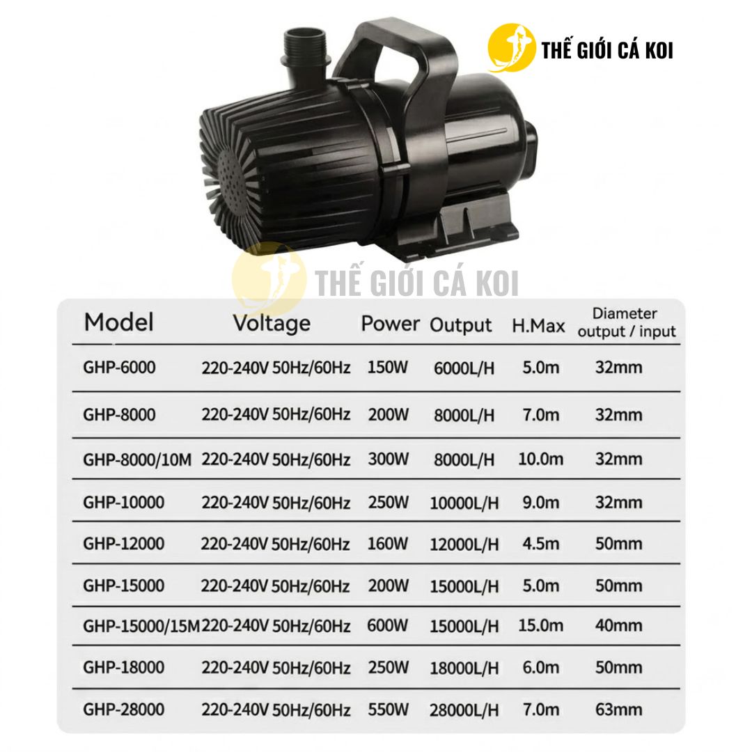 Máy bơm đẩy Resun GHP là lựa chọn lý tưởng cho hệ thống hồ koi, thác nước và lọc tuần hoàn cần công suất lớn, hoạt động bền bỉ và hiệu quả cao. Với nhiều model từ 6.000 đến 28.000 L/h, sản phẩm đáp ứng tốt mọi nhu cầu từ hồ gia đình đến công trình lớn.